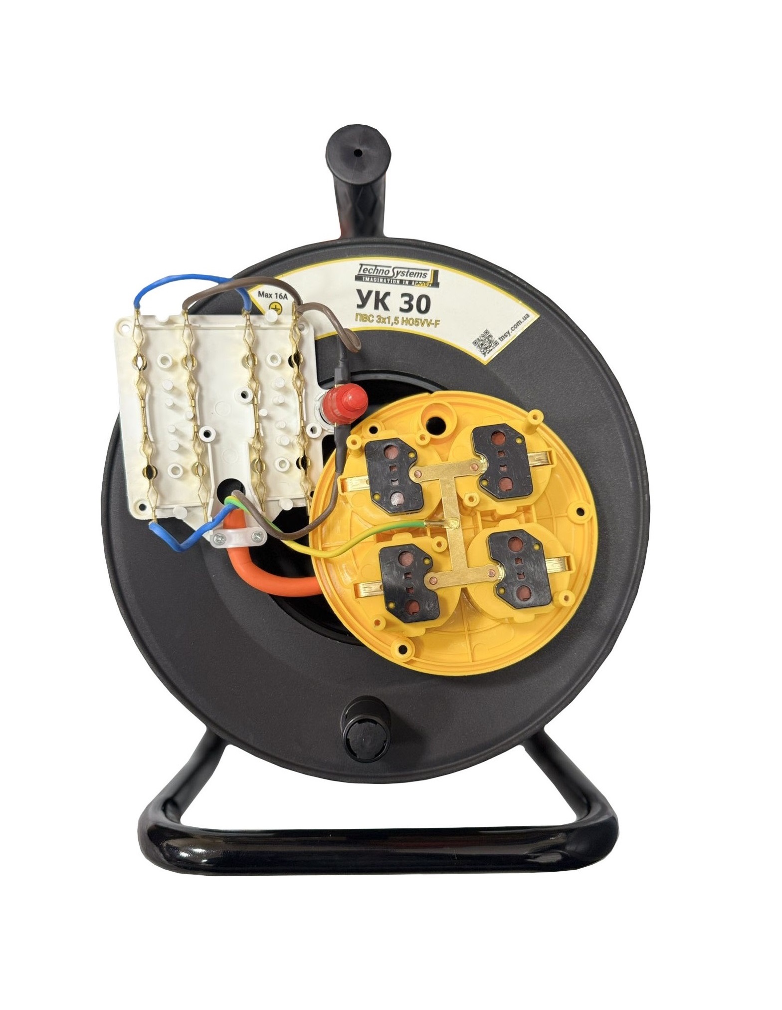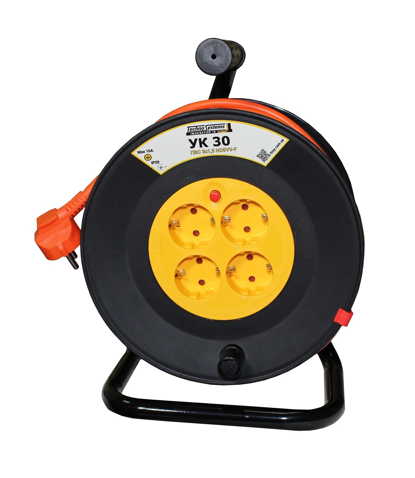 Подовжувач на кабельній котушці типу УК30 4 місця, 30м, 2Р+PЕ 3х1,5 IP20 помаранчевий. з З/К та Т/З. із захистом від превищення потужності навантаження, товарного знаку Techno Systems призначений для підключення віддалених електричних споживачів до однофазної електричної мережі напругою 250 В частотою 50 Гц.