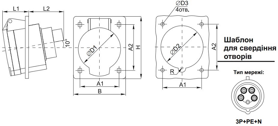 Розетка штепсельна силова 435 прихована 3Р+PЕ+N 63А 380В IP67 товарного знаку Techno Systems промислового призначення – використовується для експлуатації в трифазних мережах змінного струму напругою до 415 В.