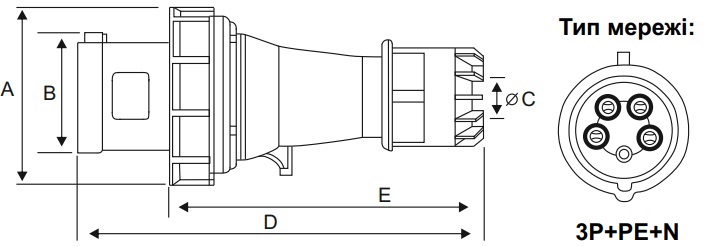 Вилка штепсельна силова 0352 PRO переносна 3Р+PЕ+N 63А 380В IP67 товарного знаку Techno Systems промислового призначення – використовується для експлуатації в одно- та трифазних мережах змінного струму напругою до 415 В.